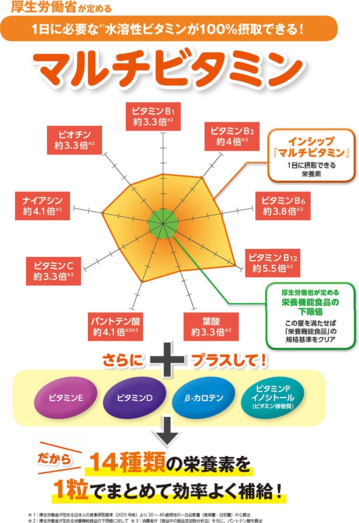 水溶性ビタミンは1日に必要とされている量を配合し、体に欠かせないビタミンを手軽に補うことができます。